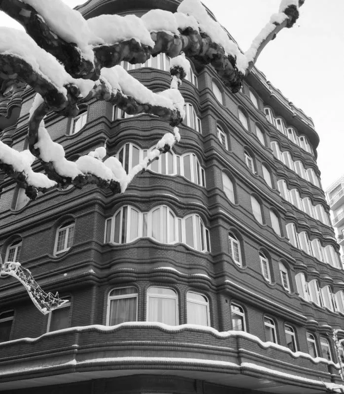 Líneas curvas imposibles para la época. Ladrillo vitrificado de Cabezón que brillaba como si la fachada hubiera sido esmaltada a mano. Y un interior que parecía traído del futuro: cocinas completamente equipadas, electrodomésticos Miele, persianas eléctricas, suelo radiante, hilo musical… Muchos de esos elementos siguen funcionando hoy, casi cuarenta años después.